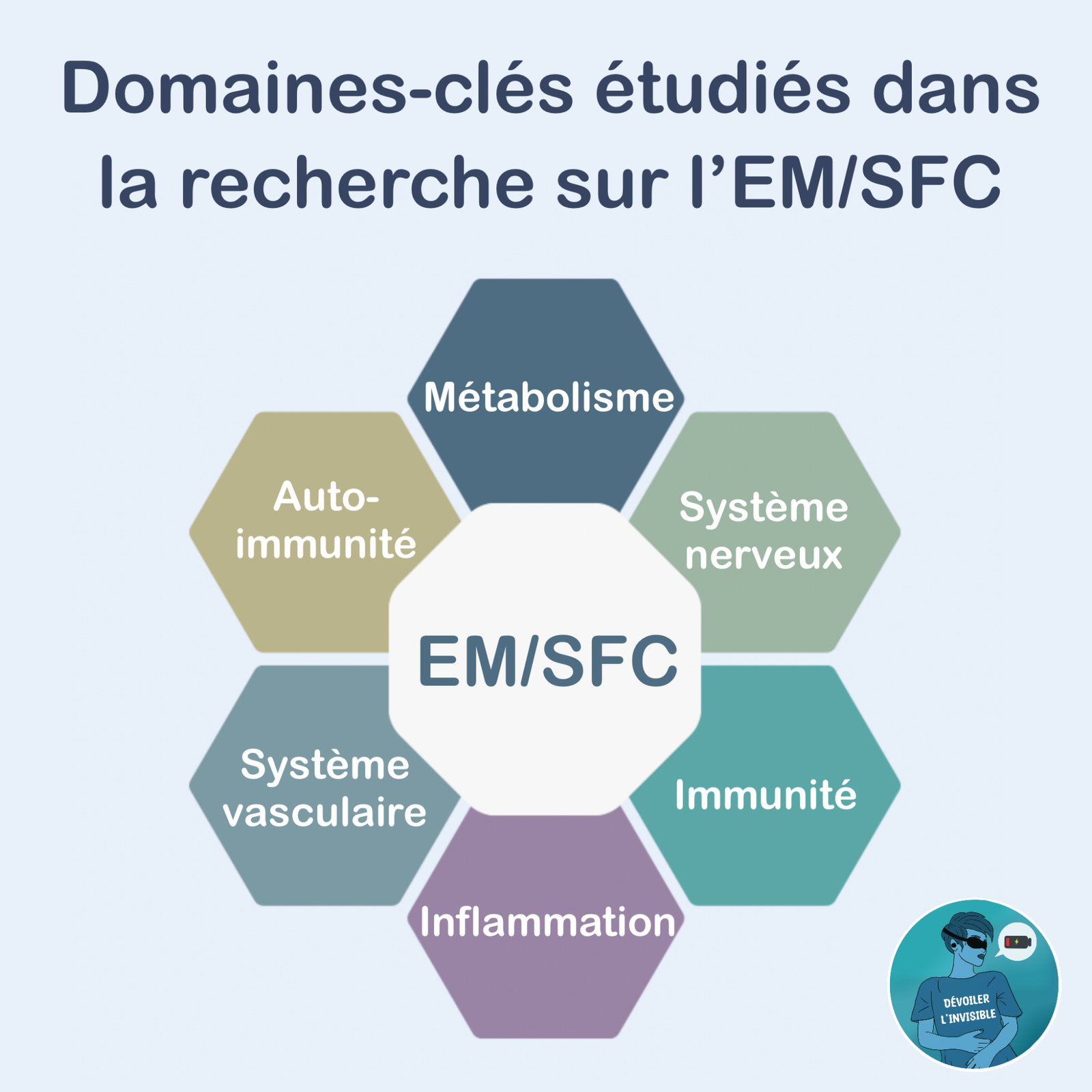 Ces axes de recherche, étudiés par de nombreuses équipes dans le monde, permettent de mieux comprendre les mécanismes susceptibles de contribuer à l’apparition, au maintien et à l’évolution de l’EM/SFC. Ils constituent aujourd’hui des pistes majeures pour affiner le diagnostic, identifier des biomarqueurs et développer de futures approches thérapeutiques.